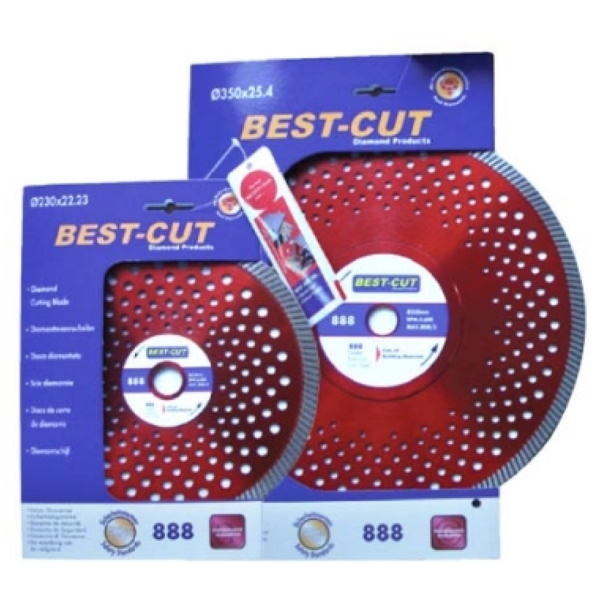 Best-Cut Diamond Blade 888 Series – hole design for high visibility through blade whilst cutting. Armoured blade core for safety. Can cut building materials, concrete products, granite and natural stone.