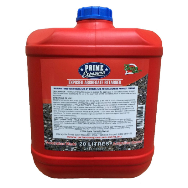 Prime Exposure is used to expose the aggregate in concrete surfaces. Prime Exposure works by delaying the set of the slurry (fat) on the concrete surface to expose the surface aggregate. Because Prime Exposure is coloured a bright fluorescent green you will be able to easily see and gauge the consistency of surface coverage.